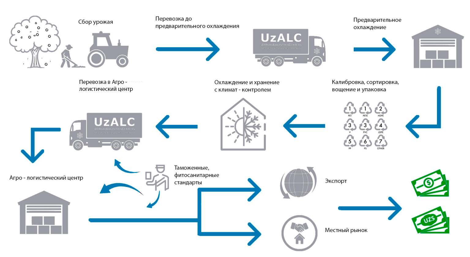 Национальная сеть Агро-логистических центров будет являться ключевым звеном в цепочке поставок между производителями, поставщиками и покупателями, что позволит эффективно перераспределяем продукты на международном и межрегиональном уровне.